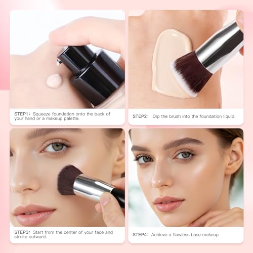 - 💎【YOUR ALL-IN-ONE MAKEUP BRUSH】This professional flat-top foundation brush is your multi-tasking tool and user-friendly for beginners.Its dense, soft synthetic bristles flawlessly blend liquid foundation, BB cream,liquid for a seamless base. Effortlessly switch to cream products—simply stipple and buff cream blush and contour. Not only can it be used as a foundation brush, but also as a contour brush, blush brush, powder brush, liquid blush brush, and more —all with one intelligent tool.