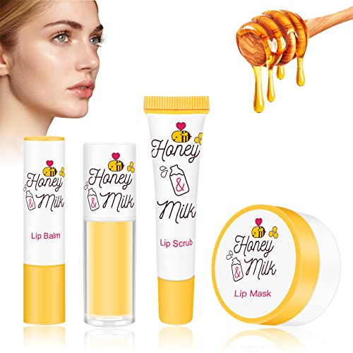LSxia 4 Piece Honey Milk Lip Mask Lip Balm Lip Scrub Lip Oil Lip Care Kit, Moisturizing & Nourishing Dry and Cracked Lips,...