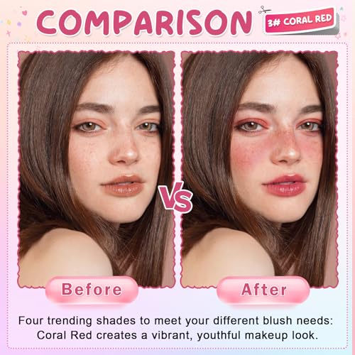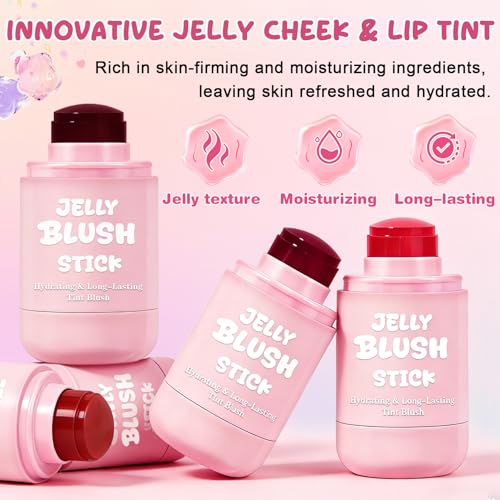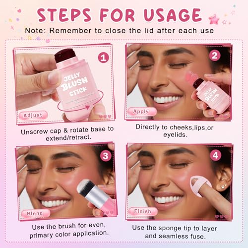 - 【Jelly Blush Stick】Available in 4 popular shades to meet your different blush needs:Nude Red for a natural daily brightening effect;Soft Pink to create a naturally rosy glow;Coral Red for a lively,youthful makeup look;Berry Red to sculpt and define a refined makeup style